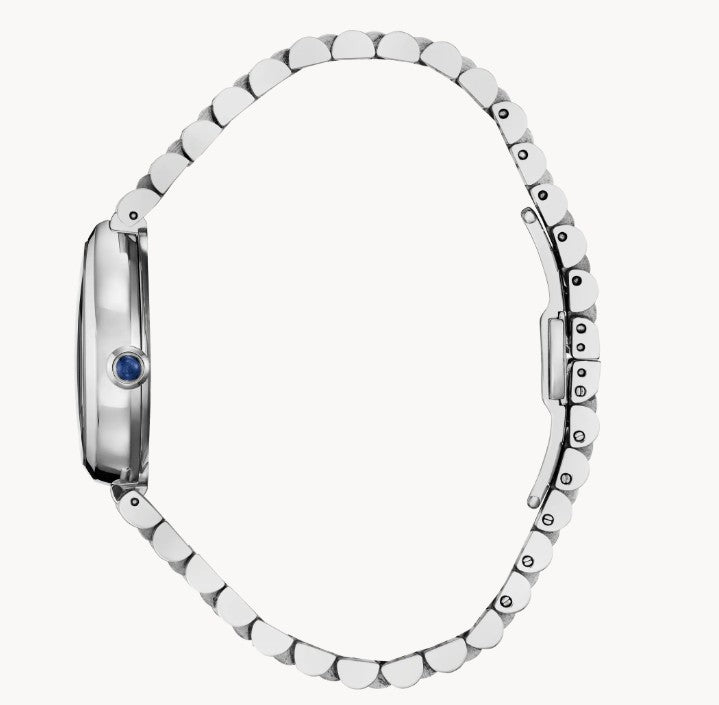 Flirty and feminine, the new Citizen L Rainell is a watch as creative and elegant as those who wear it. With subtle dimensions of 26mm by 31mm, the signature shape of the timepiece speaks for itself in understated silver-tone stainless steel. An integrated bracelet and synthetic sapphire-set crown punctuate the look. A lovely purple dial follows the shape of the case, with a brushed background playing host to refined details in applied indices and matching hands. Sustainably powered by any light with our proprietary Eco-Drive technology that never needs a battery. Water resistant up to 50 meters. Caliber E031.