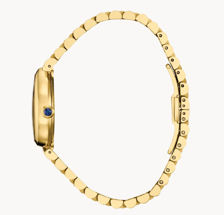 Flirty and feminine, the new Citizen L Rainell is a watch as creative and elegant as those who wear it. With subtle dimensions of 26mm by 31mm, the signature shape of the timepiece speaks for itself in an elevated gold-tone stainless steel. An integrated bracelet and synthetic sapphire-set crown punctuate the look. A lovely gold-tone dial follows the shape of the case, with a brushed background playing host to refined details in applied indices and matching hands. Sustainably powered by any light with our proprietary Eco-Drive technology that never needs a battery. Water resistant up to 50 meters. Caliber E031.