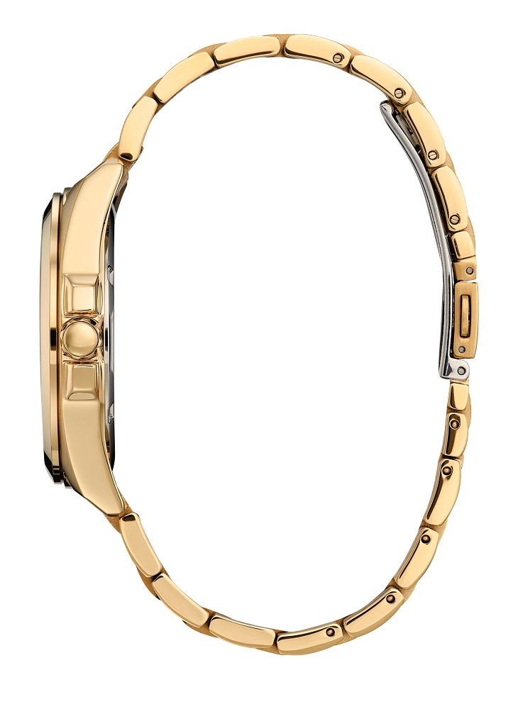 Make a distinctive style statement. Featuring a gold-tone stainless steel case and a blue 3-hand dial encased in sapphire crystal, this men’s timepiece is a combination of functional simplicity with a touch of elegance. The gold-tone stainless-steel bracelet has a fold over clasp with push buttons, giving the watch an understated refinement. Water resistant to 100 meters and sustainably powered by any light with Eco-Drive that never needs a battery.