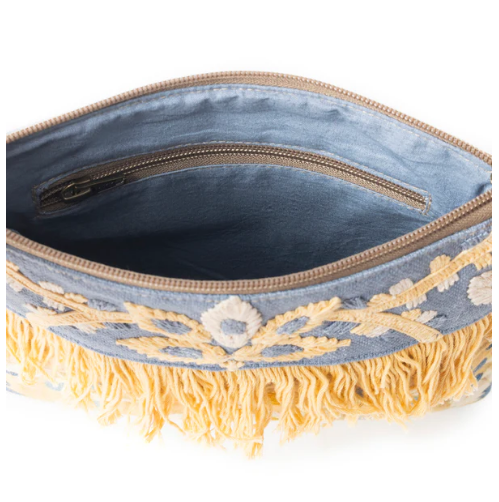 Channel vintage elegance with our two-toned crossbody bag. The front features an ornate tapestry design in rich mustard and slate, adorned with playful golden fringe, while the back offers sleek slate upcycled canvas with a practical zip pocket. Zipper-close top with detachable, adjustable shoulder strap in matching leather. Where bohemian glamour meets everyday functionality!