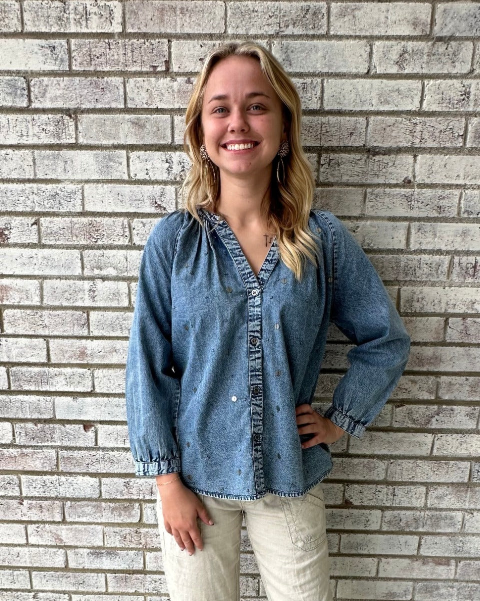 The Myra Stitched in Stardust Top in Washed Blue blends gentle elegance with a hint of celestial charm. This relaxed top for women features subtle embroidered accents that glimmer like scattered stardust across its lightweight fabric. Designed with a button-down front, round gathered neckline, and gentle puff sleeves, this top for women effortlessly blends comfort with a touch of sparkle. Perfect for dressing up your denim or layering under a cozy jacket.