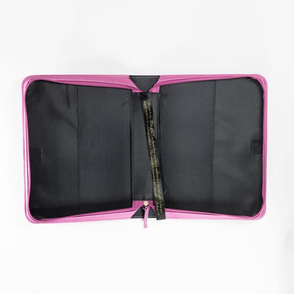 Our Divine Details collection feature deluxe bible covers with matching journals & keychains. Intricate details, fancy embellishments & fine hot stamp design puts this collection in a category all its own. Bible covers have a zippered closure, spine carrying handle & features scripture on the cover. Cover features scripture: "Follow the way of Love" -1 Corinthians 14:1.