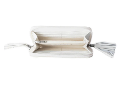 Dance through your day with this stunning wallet showcasing the look of hand-tooled leather in desert sage and cream, all with sparkling crystal accents. Adorned with flowing feathers and wildflower blooms, this desert beauty features a playful tassel charm and matching wristlet strap. Every detail tells a story of Southwestern artistry, from the diamond-stitched border to the intricate floral scrollwork. Wrap-around zipper closure and matching wristlet carrying strap complete this beautiful accessory.