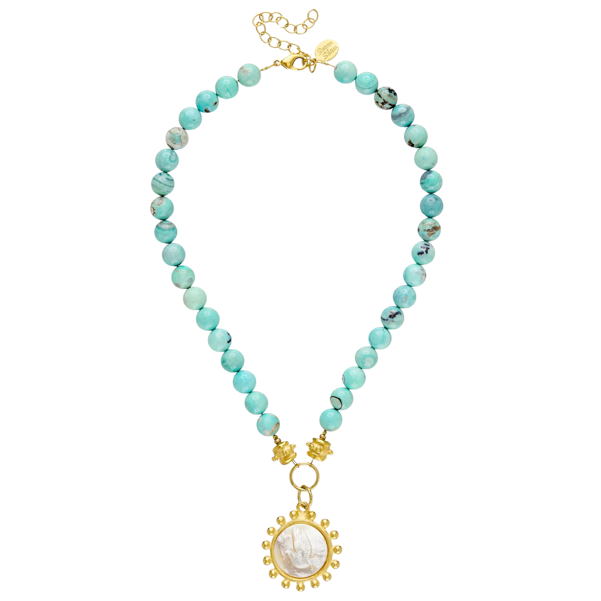Add a pop of color to your jewelry box with the Erin Engraved Dove Agate Necklace. The necklace features a beloved dove, symbolizing peace, joy and remembrance, carefully engraved into genuine Mother-of-Pearl and hanging from genuine aqua agate beads. These vibrant and unique beads contrast beautifully with the soft, subtly iridescent white of the pendant, resulting in a striking piece that will earn you compliments time and time again.