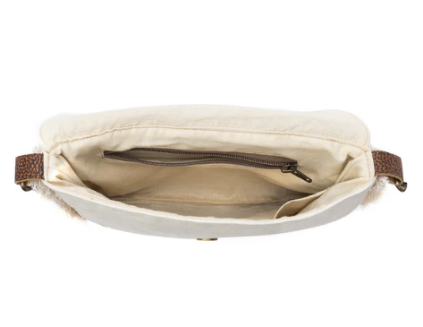 Adventure meets artistry in this gorgeous bag! Our cream upcycled canvas crossbody features bold teal triangles and rustic rope trim. Raw-edge fringe and distressed horizontal detailing create a perfectly bohemian vibe. The clean upcycled canvas back has a zippered pocket for convenience. Zipper-close top. Shoulder straps are in matching leather.